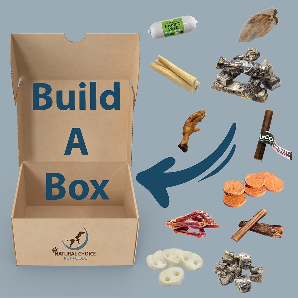 Build a customisable treat box for your dog. Delicious, natural, healthy, grain free treats & chews available to fill this treatbox. Personalise it so your dog will have all the yummy treats & chews they love!
