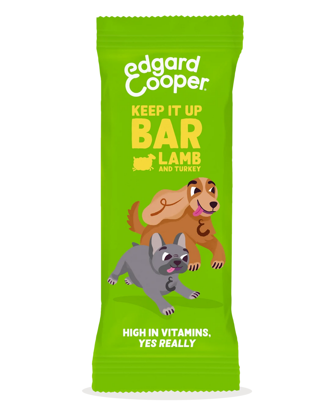 Composition Lamb & Turkey Bar: fresh turkey 28%, potato flour, fresh lamb 12%, vegetable glycerin, pea starch, potato starch, sweet potato (dried) 0.5%, apple (dried) 0.5%, minerals
