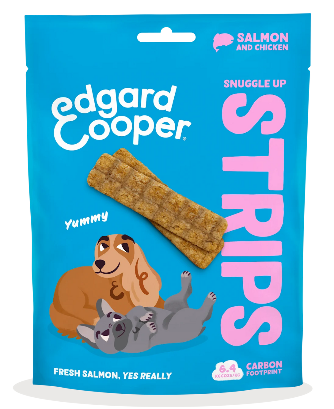 Composition Salmon & Chicken Strips: fresh chicken 58%, potato flour, vegetable glycerin, fresh salmon 7.5%, pea starch, pea fibre, minerals, mango (dried) 0.05%, strawberries (dried) 0.05%
