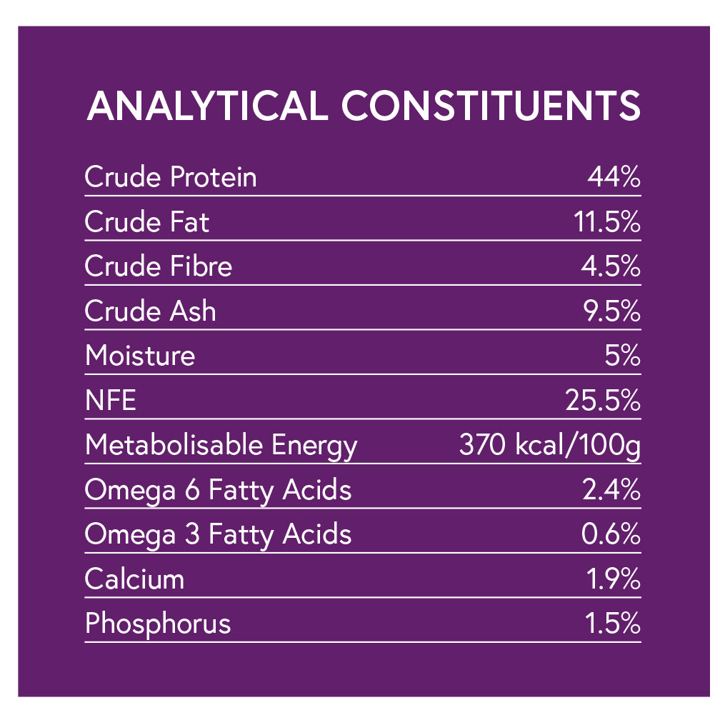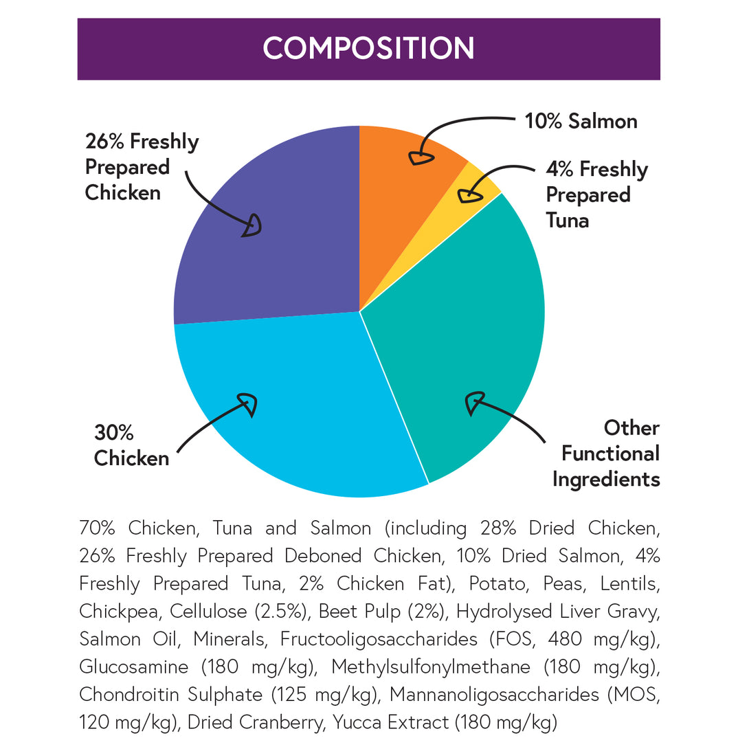 70% Chicken, Tuna and Salmon (including 28% Dried Chicken, 26% Freshly Prepared Deboned Chicken, 10% Dried Salmon, 4% Freshly Prepared Tuna, 2% Chicken Fat), Potato, Peas, Lentils, Chickpea, Cellulose (2.5%), Beet Pulp (2%), Hydrolysed Liver Gravy, Salmon Oil, Minerals, Fructooligosaccharides (FOS, 480 mg/kg), Glucosamine (180 mg/kg), Methylsulfonylmethane (180 mg/kg), Chondroitin Sulphate (125 mg/kg), Mannanoligosaccharides (MOS, 120 mg/kg), Dried Cranberry, Yucca Extract (180 mg/kg)