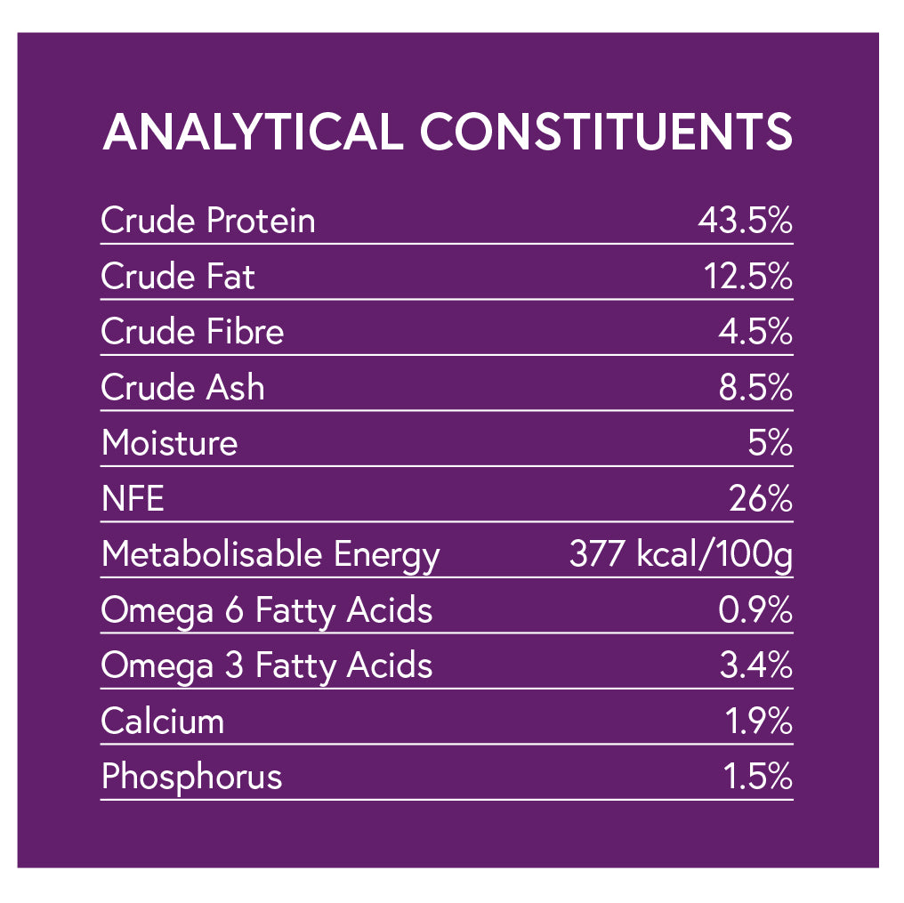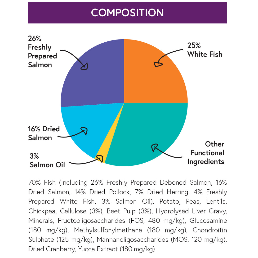 70% Fish (Including 26% Freshly Prepared Deboned Salmon, 16% Dried Salmon, 14% Dried Pollock, 7% Dried Herring, 4% Freshly Prepared White Fish, 3% Salmon Oil), Potato, Peas, Lentils, Chickpea, Cellulose (3%), Beet Pulp (3%), Hydrolysed Liver Gravy, Minerals, Fructooligosaccharides (FOS, 480 mg/kg), Glucosamine (180 mg/kg), Methylsulfonylmethane (180 mg/kg), Chondroitin Sulphate (125 mg/kg), Mannanoligosaccharides (MOS, 120 mg/kg), Dried Cranberry, Yucca Extract (180 mg/kg)
