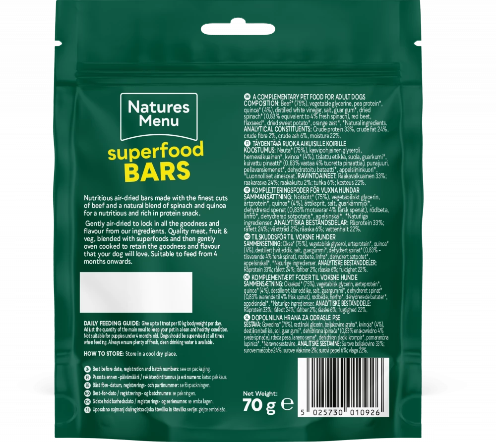Superfood bars use quality beef pieces and a natural mix of spinach and quinoa to create nutritious and rich in protein snacks.